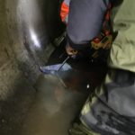 Theses baffles are made of rubber and are installed inexpensively with a cordless drill, which attaches the baffle with bolts to the culvert bottom. In this case, the culvert is made of concrete. During high flow, the L-shaped baffle bends over enough to slow the flow and let the sediment pass through. During low water conditions, the L-shape returns, so that water is retained behind the baffle, making a small pool that juvenile fish can use to rest on their passage through the culvert.