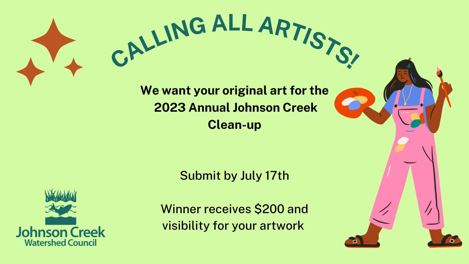 Calling all artists! We’re looking for an artist to create a design for this year’s Johnson Creek Clean-Up. Could it be you? Send us your original art on the theme of clean water, trash, and wildlife.