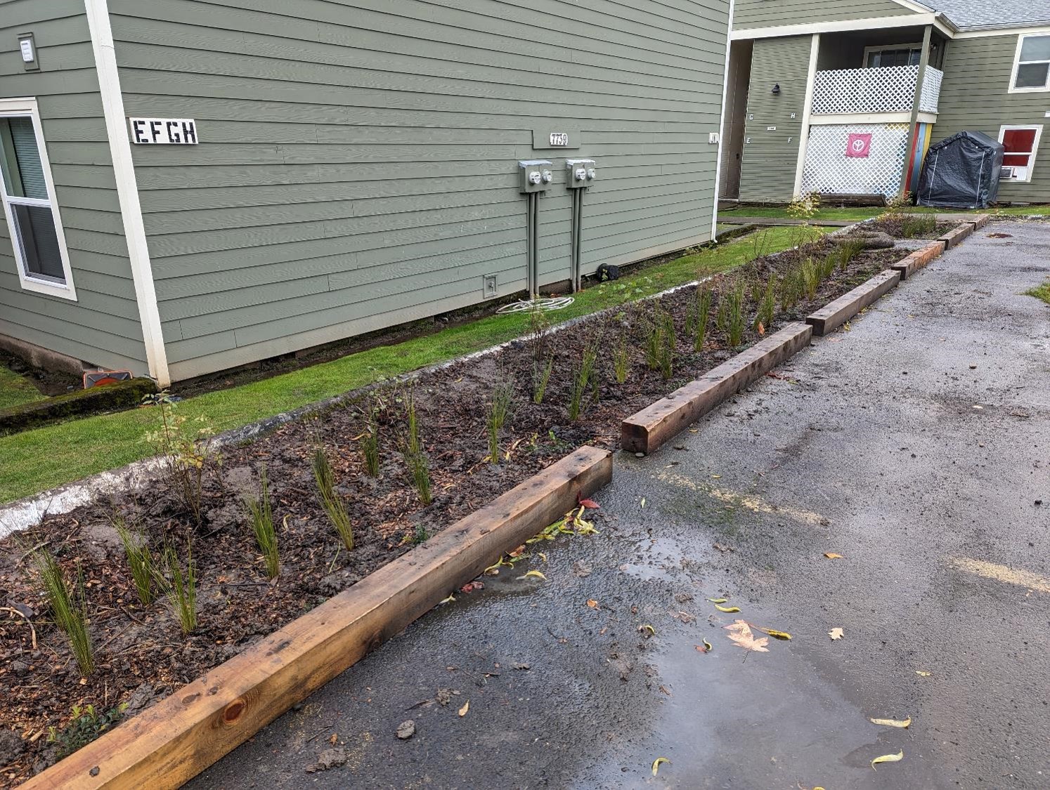 All of this hard work is to help reduce flooding at the apartment complex and improve water quality going into Johnson Creek. Stonebridge Apartments is a low income senior housing complex and each year stormwater floods the walkways to their front doors. The rain gardens will capture this water before it can reach the building walkways and allow the water to slowly infiltrate into the soil. Stormwater runoff also collects a variety of pollutants, including oil, tire particles, and trash. By collecting the stormwater in rain gardens, these pollutants are filtered out of the water before entering our waterways. As it rained everyone had a chance to see the rain gardens function first hand as stormwater flowed in from the parking lot pavement and slowly soaked into the soil.