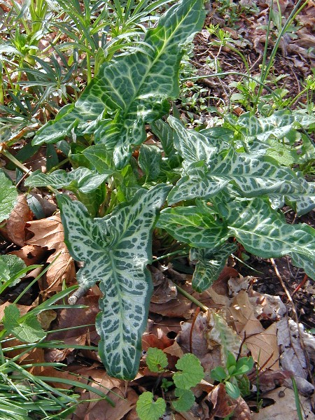 Characteristics: Italian Arum—a.k.a. Lords and Ladies—is a tuberous perennial, growing to 12 inches high. It has glossy, arrow-shaped leaves up to 14 inches long, with white or yellow “marbling”. A finger-like spadix of white or yellow flowers, partially sheathed by a large, pale-green bract, is borne on an erect stalk in spring and early summer; think cobra hood with a rattlesnake tail in it. After bloom, all parts except for the spadix wither; this develops into a spike of bright, orange-red berries, which last until new leaves emerge in autumn. Arum frequently persists above ground through the winter in our area. It is native to Europe and North Africa.