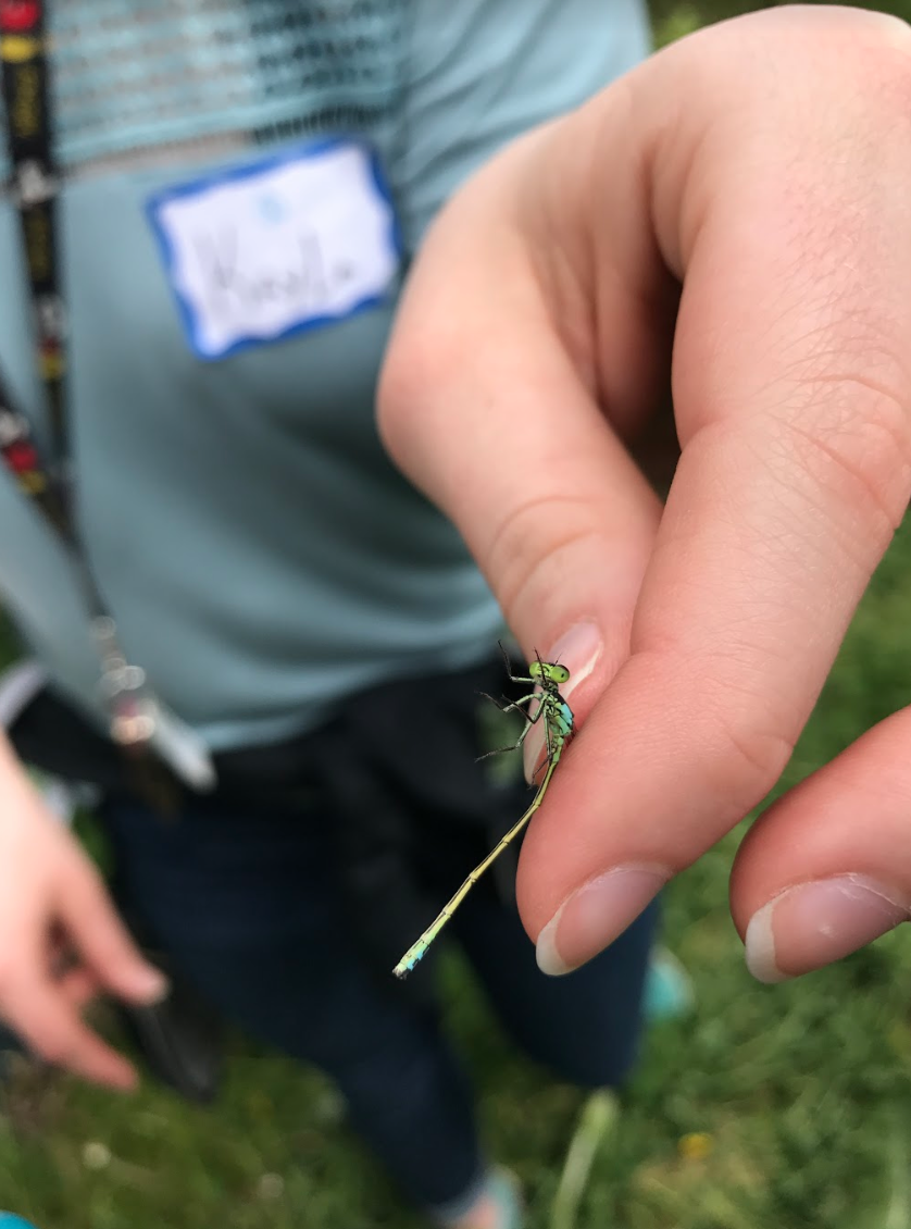 Dragonflies and damselflies are very particular about the natural aspects of their habitat; they need still water to lay their eggs, plants and organic matter to rest on, and sunlight to fly. Much like the sensitive macroinvertebrates that cling to rocks and burrow beneath the sediment within a healthy, well-functioning stream, odonates are regarded as ‘indicator species’. This means that the level of odonates observed within a freshwater system indicates the level of health and functionality of that system due to their reactivity to changes in water quality and habitat design. During the field session at Westmoreland Park after the orientation, we were surrounded by damselflies and dragonflies of diverse types and colors, representing the success of the native plant restoration around Crystal Springs. We saw Pacific forktail (Ischnura cervula), Tule bluet (Enallagma carunculatum), Eight-spotted skimmer (Libellula forensis), Twelve-spotted skimmer (Libellula pulchella).
