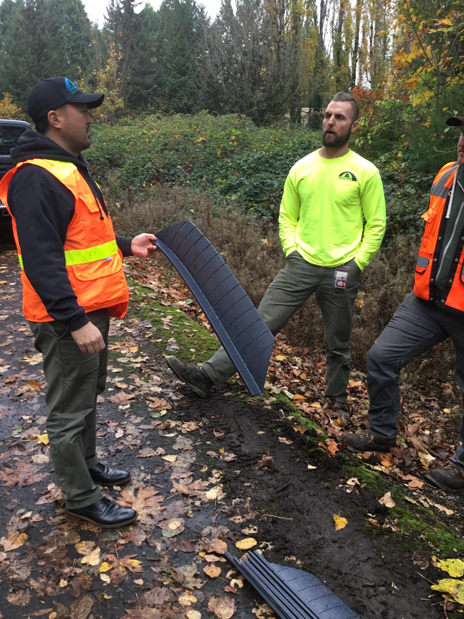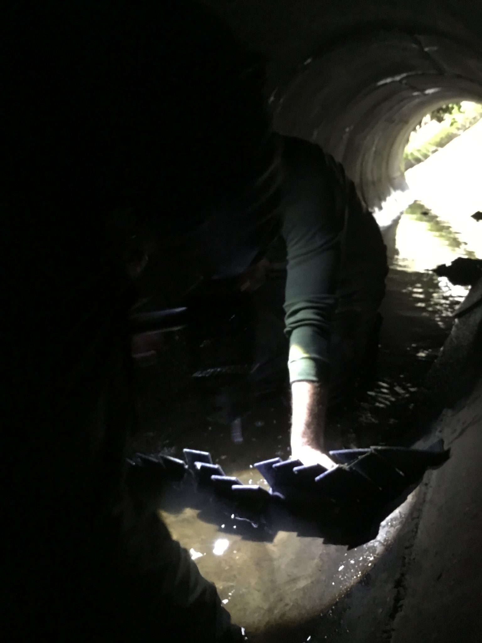 Theses baffles are made of rubber and are installed inexpensively with a cordless drill, which attaches the baffle with bolts to the culvert bottom. In this case, the culvert is made of concrete. During high flow, the L-shaped baffle bends over enough to slow the flow and let the sediment pass through. During low water conditions, the L-shape returns, so that water is retained behind the baffle, making a small pool that juvenile fish can use to rest on their passage through the culvert.