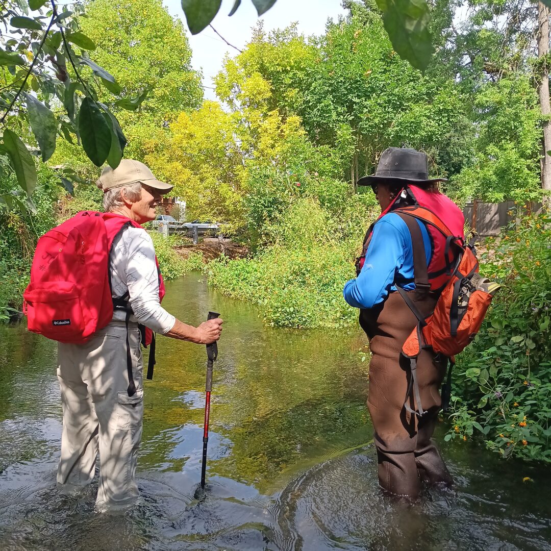 While you might not spot a beaver, you can often tell that they are in the area. As an expert, wetland ecosystem engineer, beavers are great at building ponded areas that support many species and create firebreaks along with water storage and filtration systems that improve drought and flood resilience. A beaver pond will typically be surrounded by nibbled trees and vegetation that camouflages them when collecting wood and sliding back into the pond. Dams will span the width of the body of water from a couple of feet to over a hundred feet. We survey the condition of the dam by recording the water flow. Is a slight trickle of water going over the dam or through it – it’s probably an active dam or is it an older dam that allows a lot of water to flow through?