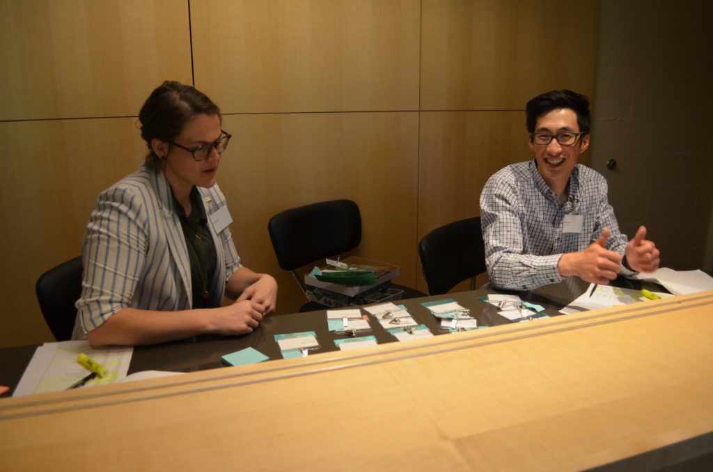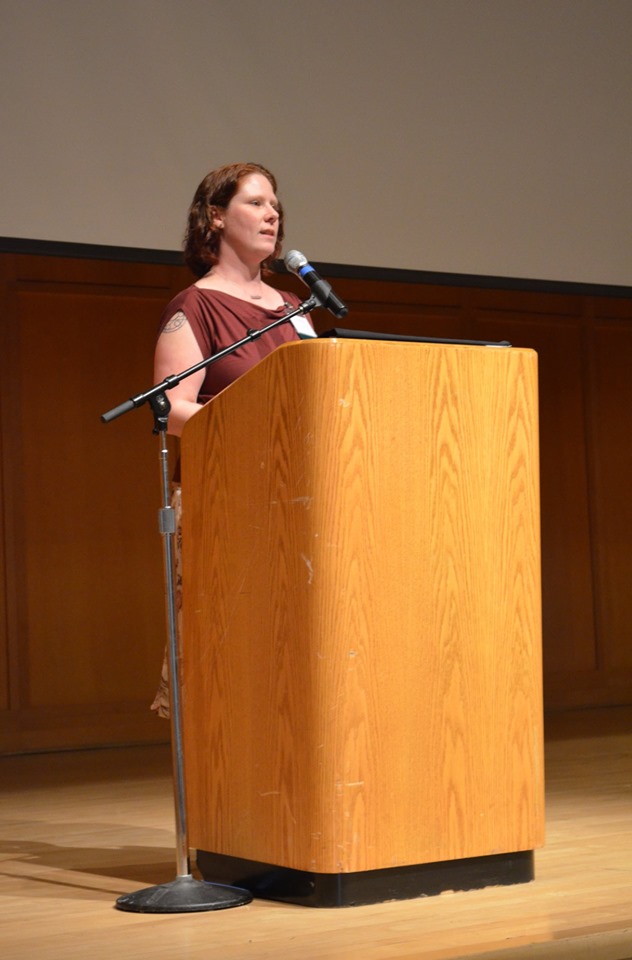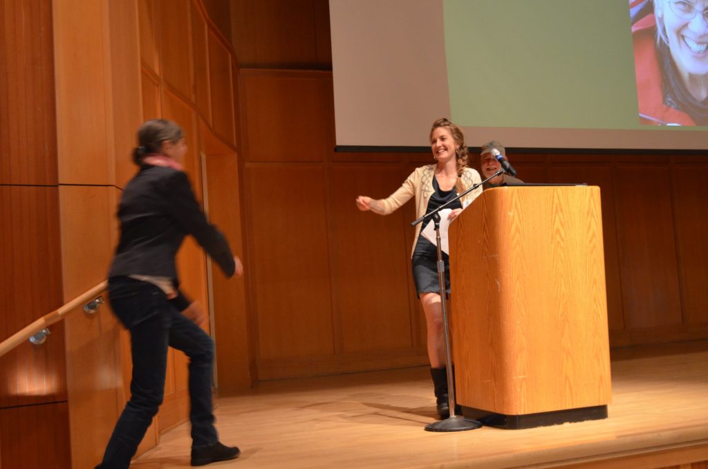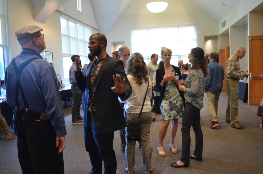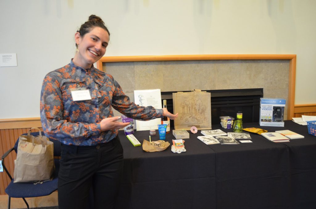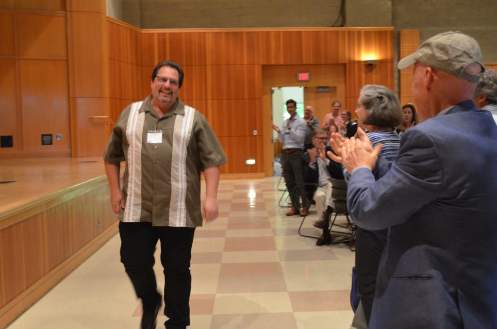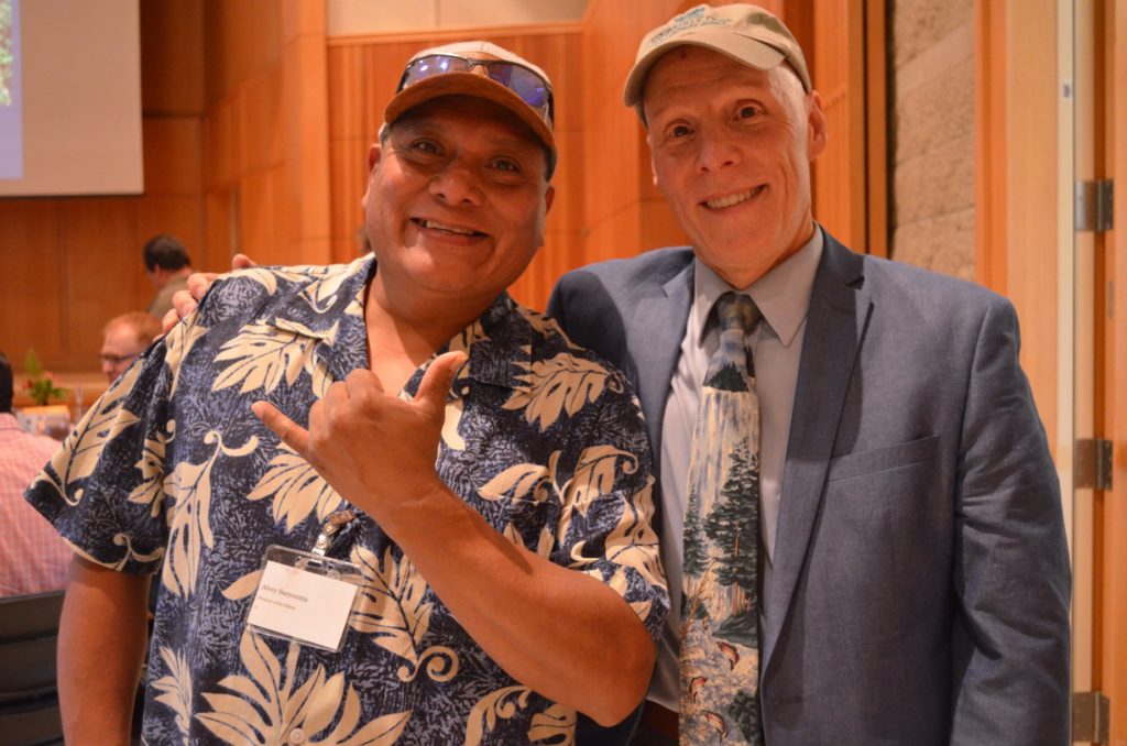 Carol Zyvatkauskas receives the Ernie Francisco Award for Volunteer of the Year from Courtney Beckel, JCWC Volunteer Program Manager.Guests network and make new friends during the Social Hour. Interns Erin Rivers (l) and Jeffrey Lee (r) manage registration for 199 people.Sam Sharka, JCWC Board member, shows off one of our silent auction tables.John Nagy, jurisdictional Board rep from Clackamas County receives a lifetime service award: 25 years on the JCWC Board (includes 1 year on the predecessor organization, Johnson Creek Corridor Committee).Melanie Klym, JCWC Board Chair explains why she’s been a Board member for six years.Alvey Seeyouma, Wisdom of the Elders (l) and Daniel Newberry, JCWC Executive Director (r) ham it up for the camera.