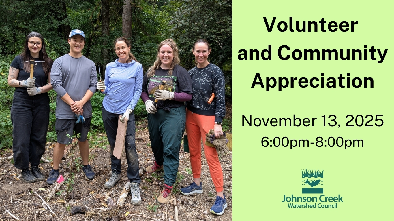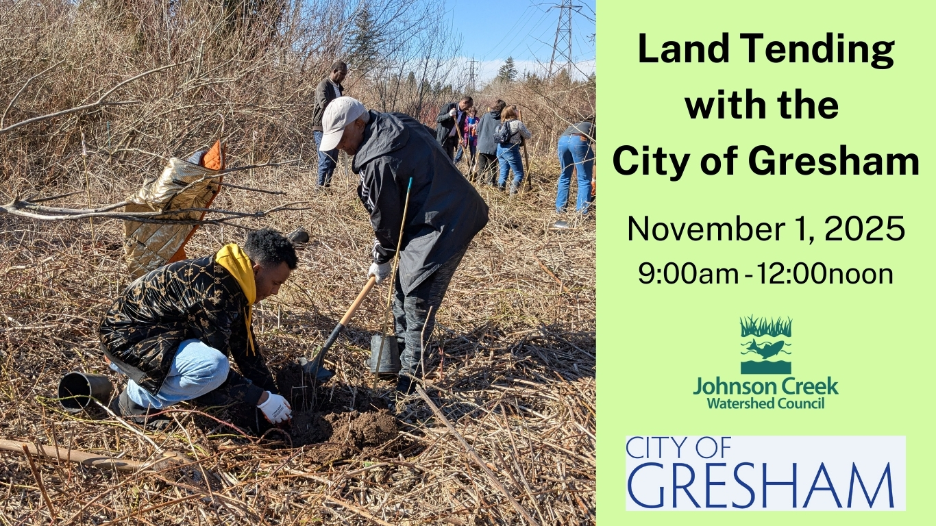 Due to weather, this event is cancelled Join the Friends of Tideman Johnson Park and the Johnson Creek Watershed Council for a morning of stewardship and land tending! Tideman Johnson is a small but sweet park along Johnson Creek and the Springwater Corridor Trail in SE Portland. No experience necessary! When: Saturday, November 1st, 9:00 […]