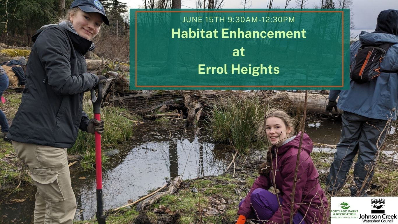 Join the Friends of Errol Heights, Johnson Creek Watershed Council, and Portland Parks & Recreation at the newly renovated Errol Heights Park for a morning of stewardship! We are working to revegetate areas that were disturbed during the recent construction. This park is home to a plethora of wildlife including beaver, woodpeckers, ducks, and dragonflies!