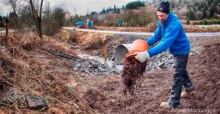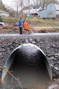 Despite snow, rain, and wind, our watershed-wide assessment of potential fish passage barriers continues! Last year, our volunteers and interns collected baseline information on more than 180 culverts and stream crossings—this was a huge help in reducing the number of culverts we needed to visit with our professional fish biologist, Ted Labbe of Kingfisher Ecological Services (KES).
