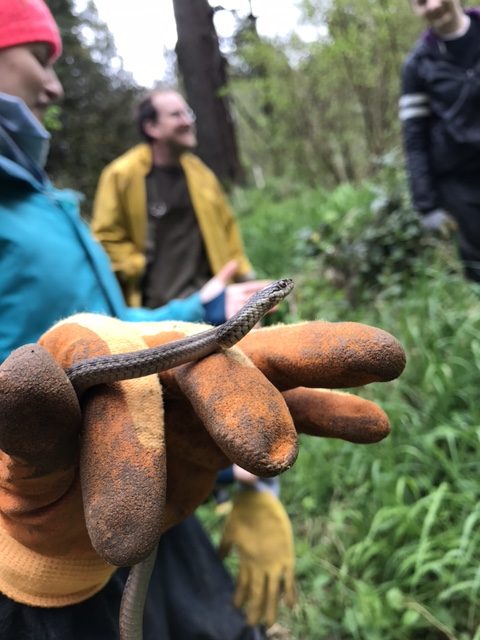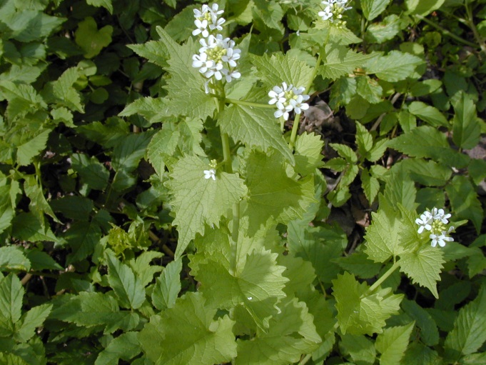 You’d scarcely think to look twice at it: to all appearances, garlic mustard (Alliaria petiolata) seems an inconspicuous bit of green in a sea of more green. Then time goes by…and it IS the sea of green! This pernicious invasive plant out-competes native species through a combination of its growth pattern (early emergence and large size help it win the competition for light and water) and allelopathy (releasing a substance from its roots that is toxic to native plants—think “chemical warfare”), making it a priority for removal. Once again this year, we have assembled a “task force” of volunteer interns to hand-pull this species over the next couple of months; we’ve already covered a lot of ground, and can tell that our efforts from previous years are paying off!