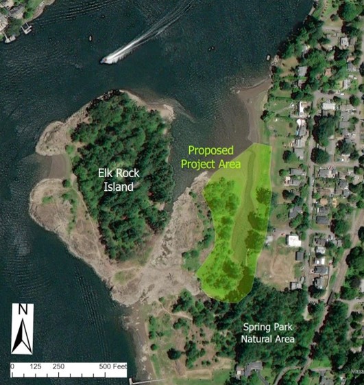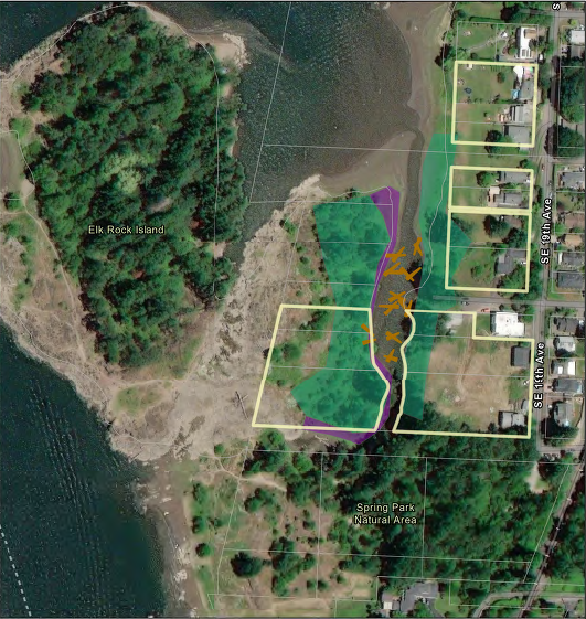 The concept design for Elk Rock Island includes placement of key pieces of large wood in the back channel alcove and floodplain, management of invasive plants, and restoration of native wetland and riparian plant communities. This project will enhance winter rearing habitat for coho, fall & spring Chinook, Pacific lamprey, and steelhead. The majority of this property is owned by the City of Milwaukie and managed by the North Clackamas Parks & Recreation District, and both entities are in support of this restoration effort. Because this project is adjacent to a public park, there are wonderful opportunities at this site for public education and stewardship events, and interpretive signage.