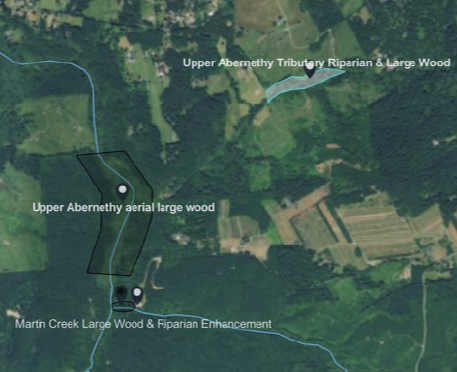 Port Blakely will be harvesting timber on lands near the proposed restoration work and will provide non-merchantable timber, root wads, slash, and at cost large wood (60-80’ length, 18-24” DBH) totaling at least 400 individual logs for the aerial large wood project and associated in-stream log placement in floodplain tributary channels and along the mainstem of Abernethy Creek. The Upper Abernethy Tributary and Martin Creek components will supply another 200 large logs in a series of log jams placed in these cool water tributaries to Abernethy providing gravel sorting potential and improving spawning habitat.