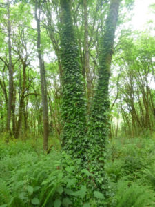 If you have ever visited a park or natural area in Oregon, you have probably seen non-native ivy sprawling across the ground or climbing trees. Hedera hibernica (Irish Ivy) and Hedera helix (English ivy) are the most common invasive ivies in the Pacific Northwest.  Invasive ivy is a threat to understory biodiversity because it out competes native plants for sunlight, water, and soil nutrients. Ivy also climbs trees to get more light for photosynthesis. The weight of ivy on trees is a significant weight burden and can often kill trees. Ivy is such a threat to native species and ecosystems that, in 2010, the Oregon Department of Agriculture banned the sale, propagation, or transport of English Ivy.