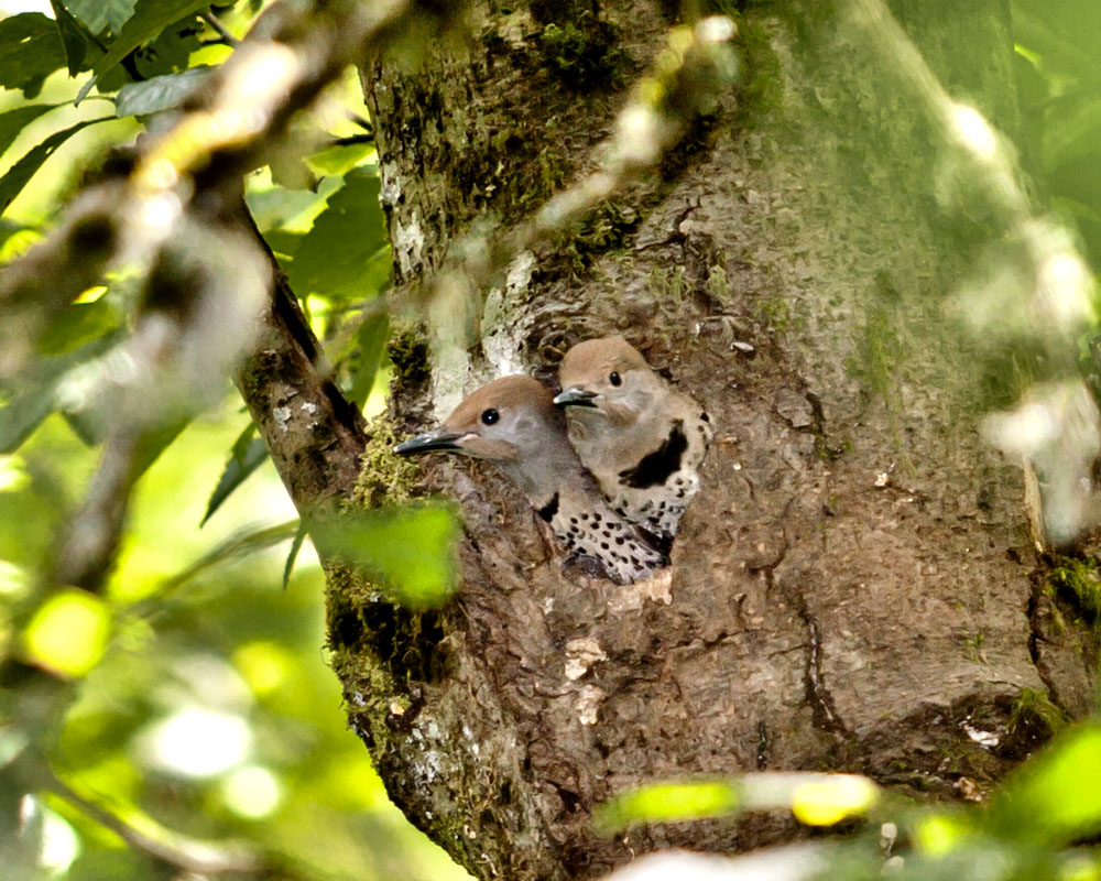 Dead trees (called snags) and fallen wood (called nurse logs) provide tremendous habitat for wildlife. Insects find shelter and food. Cavity nest birds, like the Northern Flickers in the photo above, need dead trees to raise their young. Birds and mammals use snags to store food, such as the acorn woodpecker, and some small mammals, such as racoons, will nest in hollow tree trunks. Additionally, when dead trees fall into the creek, they provide incredibly valuable habitat and protection for salmon, lamprey, and other aquatic organisms. Leave your dead tree standing and maybe next spring you’ll get to watch some baby birds grow up. For more information regarding snags and fallen wood, refer to this publication from the Washington Department of Fish and Wildlife: https://backyardhabitats.org/wp-content/uploads/2017/07/Snags-Living-with-urban-wildlife.pdf