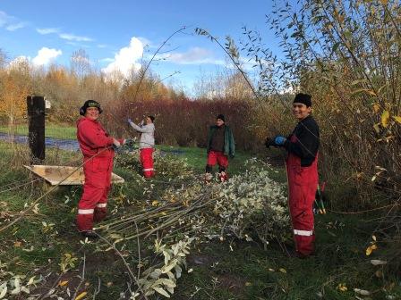 Photo: L to R Kate, Shane, Mimi, Kai, Miguel, Bird, and PJ removing garlic mustard on properties adjacent to Johnson Creek before they seed.