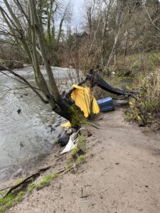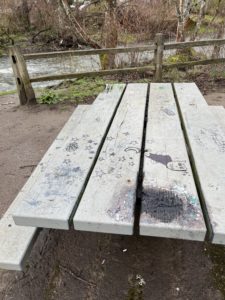 On the west side, a picnic table close to JC is burnt and graffitied (photo). There’s a lot of ‘stuff’ on the bank of JC (photo).