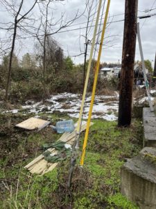 The snow had mostly melted and the creeks were running swiftly. Very minor litter, including lots of dog poop, bagged and not. On the east side of JC we saw the same remains of possible camping as in our last report, plus a few large items we didn’t pick up close to the northeast edge of the parking area (see photos). I also took a picture of the trash ‘dump’ that is encroaching onto the park property. I’m not sure where the park starts.