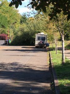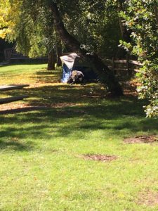 There was a camper parked at the north eastern edge of the park on the street (see pic). There was a tent on the grass in between the creeks (see pic). There was a bike on the other side of the fence near the street, to the right of the playground equipment as you face the street. I moved a wet sleeping bag, bike wheel and small table to the trash can.