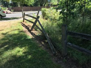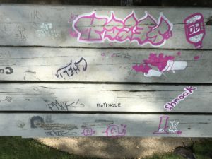 I found a piece of plywood, which I moved to the trash can near Johnson creek (see pic). There was lots of dog poop (and human poop by creek). Graffiti on a picnic table near crystal springs creek (pic). Broken fence by playground (pic).