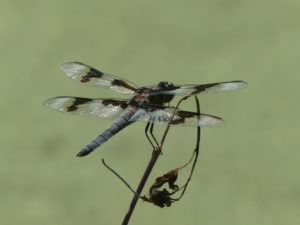 The new pond by 45th is quite high, water flowing around the dam to enter the creek channel. The large pond level has also risen, though it is still choked with algae and duckweed. Lots of dragonflies around, like this eight-spot.