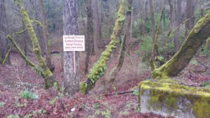 I entered Veteran’s Creek Natural Area at the Mt. Scott Blvd entrance. Right at the entrance a gardening company has nailed an advertisement sign for their company to a tree. Up the dirt road leading into the natural area, near the entrance next to the apartments, somebody has dumped a couple bags of trash. Further up the dirt road on the left someone has planted a number of house plants and added accent lighting. They threw the empty flower pots over the side of the hill along with a beer can. And in the woods at the eastern end of the natural area along the creek is an illegal campsite that I first reported on the 9th of March. I reported the tent’s location again today. On a brighter note the trillium is starting to bloom in the woods here and it was a beautiful day to enjoy Veteran’s Creek.