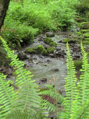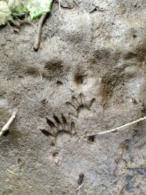 “I traversed the creek and surrounding uplands. The habitat is remarkably diverse with abundant native plants in flower: Saxifrage, Yellow Violet, Trillium, Spring Beauty and Salmon Berry. Found and pulled approximately 100 blackberry plants. I didn’t find much ivy until I found the mother load where a tree had fallen over a private fence. The tree is covered with ivy with the vines being over ¾” thick. I will take shears next time and cut the vines at the base so the ivy dies. Pulled what I could that was growing onto the Natural Area, a large arm full. Coyotes have been extremely prevalent this year and appear to live and hunt on Area 1 and 2 as well as on private land. Also have a healthy deer population and have seen many animals including a 6-point and 4-point buck. Waiting to see the fawns.”