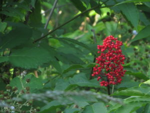 The morning was filled with birdsong as I walked around the boardwalk area. Two rabbits were hopping by the side of the path and the early bird catches the snake. A large branch had fallen and landed on one of the signs warning of flood danger so I moved it off. The fence replacement is still intact! Plus, red elderberry! There was trash under the bridge but the bag I had wasn’t large enough so I’ll pick it up next time I’m there.