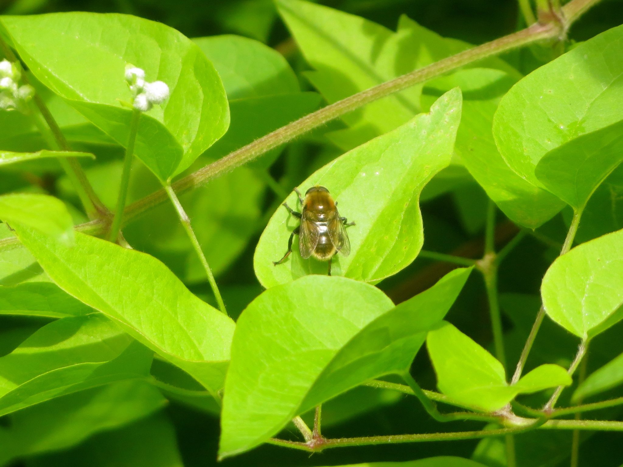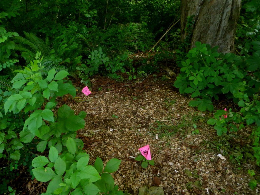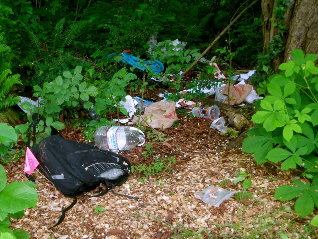 Contrary to popular belief, not every visit of a park steward has the glamour and allure of removing blackberry canes the size of a baby’s leg or becoming so entangled in clematis the steward must cut their way out. Trying to find and identify garlic mustard at the end of May is…not going to happen for a while. Sometimes the park steward has to deal with what’s “left behind.” Last week while I was there, I noticed a lot of debris left under a tree. I contacted Susan to arrange to get one of those grabber sticks and we met this morning before a group of middle school volunteers arrived to mulch what had been planted in January. It was a beautiful morning and here are before and after pictures plus one bee.
