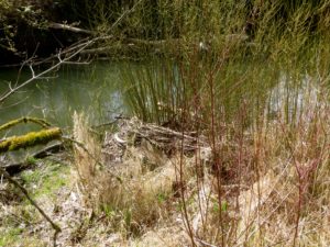 I parked in the lot and headed west on the Springwater. Before I got to Tideman/Johnson, I noticed a few freshly fallen trees to the right of the trail in, or just by, the creek. I headed down to investigate and saw lots of debris collecting under the overpass (photo). Back on the Springwater, I headed to the side path to the Tideman/Johnson area. Happy to report the trash had been cleared from the last time I was there. I walked through the area where a lot of the Watershed Wide plants had been planted and saw lots of little, green, leafy things emerging. Since I was at a different location during that event, I’m not 100% sure what everything that was planted is just yet. About four Vendange 500ml Merlot containers were in the marshy area (maybe it will keep the invasive impatiens from growing?) but I was unable to get them out. I continued up and out of this area and went down to the lower path by the creek. The one camp I reported on March 6th was still there. If it’s still there next time I go, I’ll report it again. There was one small area along that path that had “something” going on but I’m not sure if it was a small amount of trash or a tiny tent, or what, and I didn’t feel comfortable getting any closer to investigate. Overall, the site had minimal, noticeable trash. There were a lot of birds but the only one I recognized was the sound of a hummingbird, and later, an eagle flying overhead!
