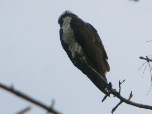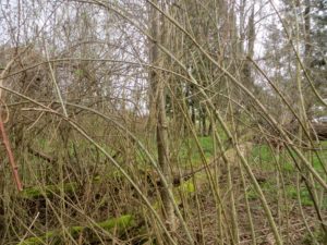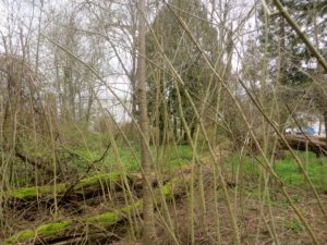I wanted to check on the flat area in the north part of the park first. There was a large tent set up. When i got home, i sent an email to the appropriate people provided in the handbook. Then I went more to the south end of the park to check on the plants that had been planted in January by groups of volunteers. They were looking good! An osprey was flying around (they have a nest by the Springwater) and landed in a tree. I headed to the area I’ve been working on since last year, and the first thing i noticed was the red-flowering currant. Last year it was completely entangled in a thick mess of clematis and blackberries. This year, upright and gorgeous. I went to work on the opposite side of the path removing clematis and blackberry from young trees. A few new starts were coming up in the area now that there is more light, but i’m not sure what they are. I took pictures and will keep an eye on them. I also yellow flagged some fig buttercup. The only down side of the day was when two large, unleashed dogs came barking and running towards me. I just stood there and they kept their distance but kept barking. I didn’t see the owner but someone was yelling for them to come back and eventually they did. I don’t think they were associated with the tent that was there. Possibly a worker in the area or there was a truck parked nearby that someone could have been living in. In any event, I was glad I was wearing a bright, neon vest a friend had giving me making me more visible since i’m usually in brown.