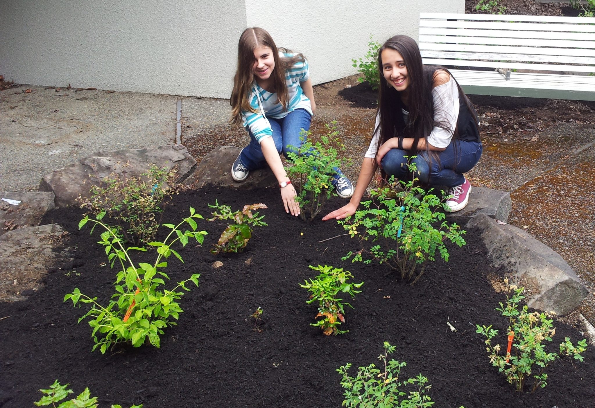 Alivia and Avery help revitalize the native plant garden in the atrium at JCWC Headquarters. Photo by volunteer Curtis Cooksey.