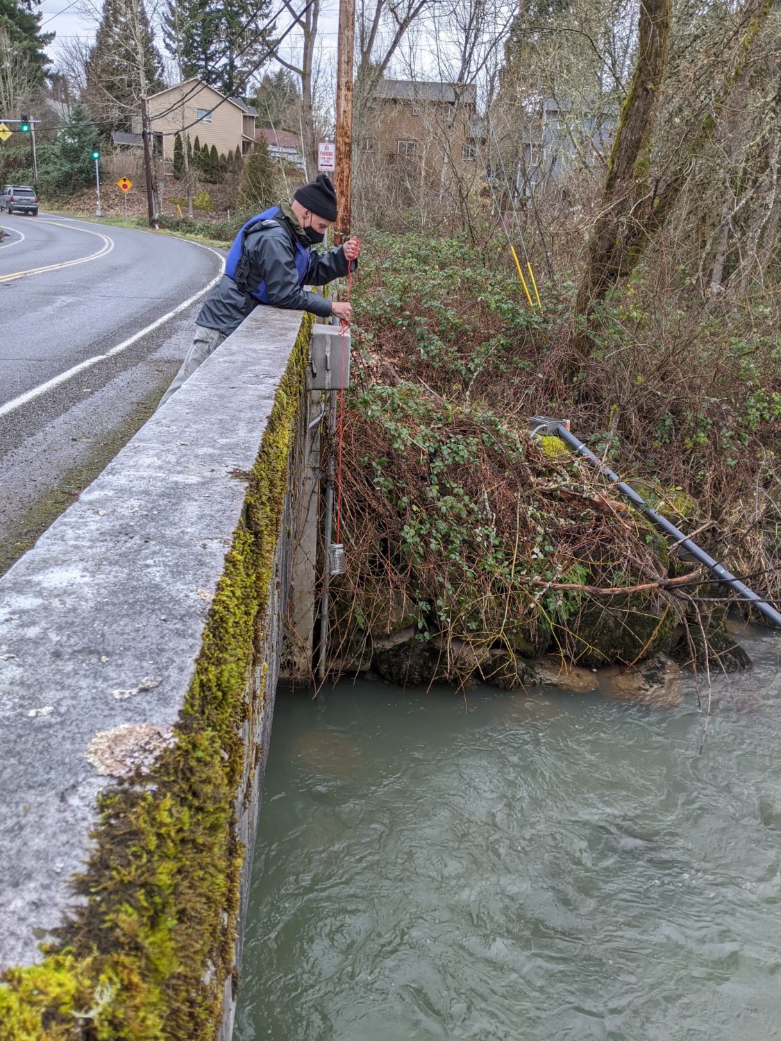 On Monday, January 10th Johnson Creek Watershed Council participated in the United States Geological Survey’s first ever Turbidity Blitz event. The purpose of the event was to try to get a “snapshot” of turbidity levels in the Johnson Creek watershed for one point in time. The event measured turbidity at 33 sites throughout the Johnson Creek watershed. Water samples were collected for each site twice using a mason jar dipped into the stream flow between 10am and noon. At some sites the mason jar was lowered down from a bridge using a rope. JCWC helped collect samples at 6 sites. Gwyn even collected all of her samples on her bike!
