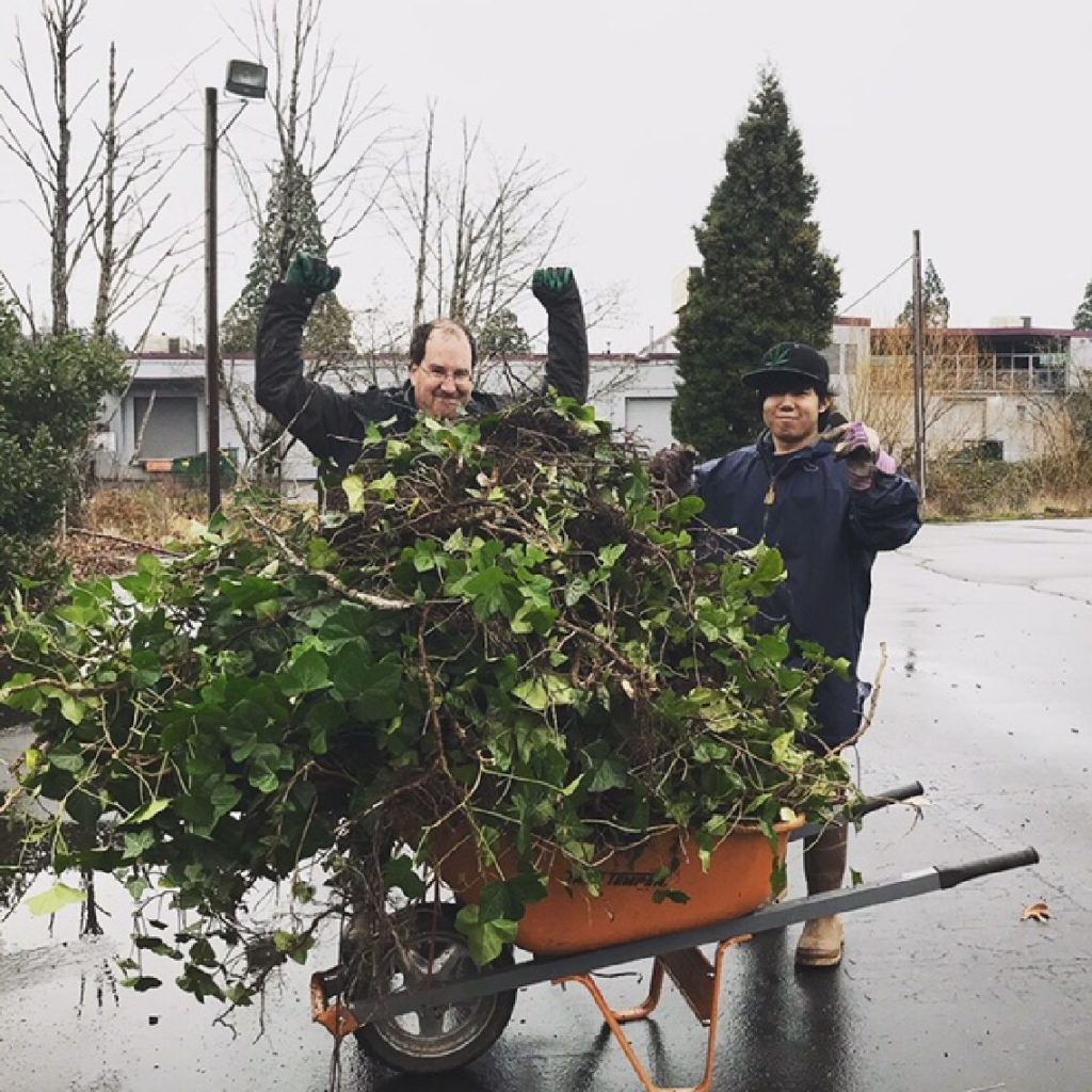 No, that’s not a typo: For the month of January, Hirozumi Kobayashi—“Hiro” for short—did an internship through the Pacific International Academy, serving twice per week at the Johnson Creek Watershed Council. Hiro worked with JCWC staff to help plant trees and remove invasive plants, focusing mainly on the Council’s office. With Hiro’s help, we removed all the blackberries from around our parking area, and most of what was growing along the bank of Johnson Creek. And, when he wasn’t helping JCWC, he was working his other internship at the ReBuilding Center doing more good work.