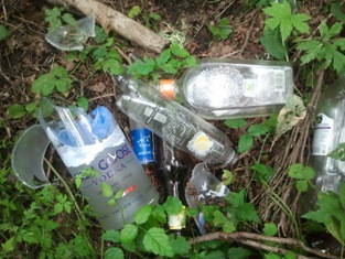 After weeding, I drove up Vrandenburg Road where I discovered two illegal dump sites. One dumping was along the road in plain sight while the second dump site was on a downhill slope, not visible from the road. I found it after investigating off-road tire tracks. The trash at this site consisted mostly of liquor bottles.