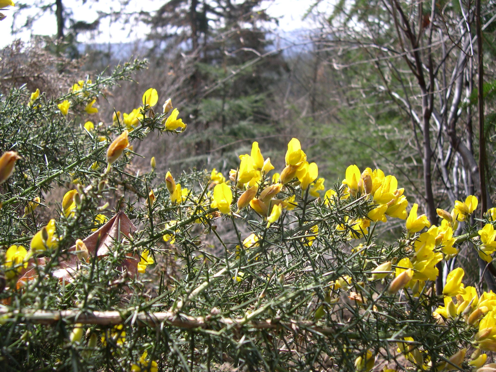 Characteristics: Gorse is a spiny, dense evergreen shrub in the pea family, typically 2-3 meters (6-9 ft) tall. Young branches are green, but turn brown with age. Leaves are stiff and needle-like, 5-15 mm (1/4-1/2 in) long; branch spines grow at the leaf axils, making gorse quite unfriendly. Yellow flowers bloom near the ends of branches on previous year’s growth, singly or in groups of two or three, mostly during late winter/early spring. These give way to pods 15-18 mm (1/2-5/8 in) in length, containing many shiny, olive-green or brown seeds.