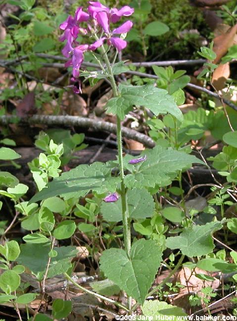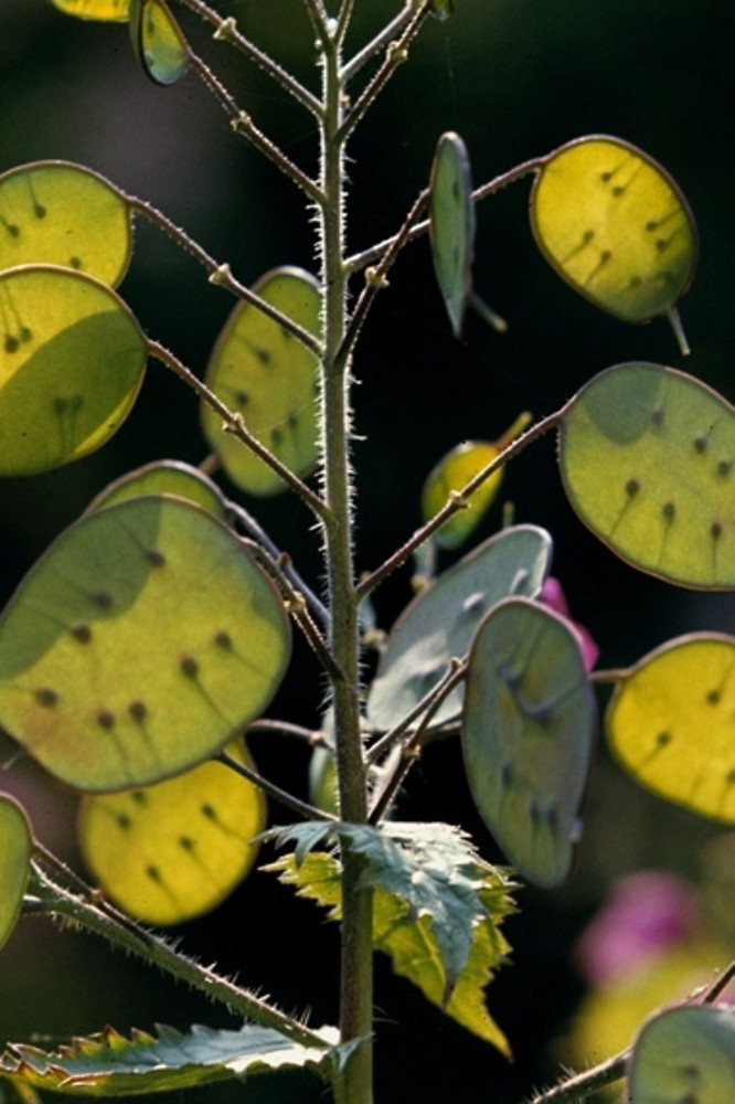 Characteristics: Money plant—also known as Honesty, Moonwort, and Silver Dollars—is a tall (to 1 m/3ft) biennial in the Mustard family with a hairy stem. Leaves are alternate, 8 cm (3”) long and up to 5 cm (2”) wide; lower leaves are coarsely serrated or shallowly lobed with long, hairy petioles that are green or reddish purple, while upper leaves are sessile (no stem) and smaller. Basal leaves of young plants are more narrow than the leaves of mature plants. Showy white to purple flowers, roughly 2 cm (¾”) across, bloom in mid-spring in elongated clusters (“racemes”) at the ends of the central stem and upper side stems. Distinctive flattened, oblong seed pods follow in summer and early fall; they are green and opaque at first, becoming translucent and papery-white with age and persisting into winter. Money plant is native to southeastern Europe, and is an introduced ornamental.